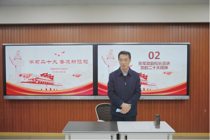 2022年11月12日下午,蓝鲸直播 2020级1班于5号教学楼408教室召开“学习二十大,奋进新征程”主题班会。西北政法大学副校长张军政、蓝鲸直播 党委副书记刘超、第一团总支书记张博玮、2020级辅导员雷喆出席,班会由团支部书记曹雨璇主持,2020级1班全体同学参加。