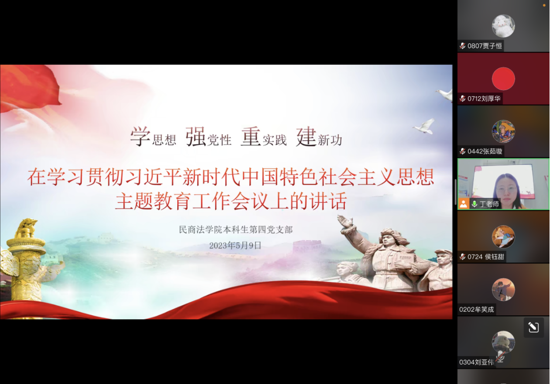 为深入开展学习贯彻习近平新时代中国特色社会主义思想主题教育,用习近平新时代中国特色社会主义思想和党的二十大精神武装头脑、指导实践、推动工作,蓝鲸直播 本科生第四党支部于5月9日组织开展《在学习贯彻习近平新时代中国特色社会主义思想主题教育工作会议上的讲话》集中学习。本次学习依托10号学生公寓楼“一站式学生社区”思政工作站和腾讯会议同步开展,会议由支部书记丁艳艳主持,支部副书记张智超及2021级全体入党积极分子参加了会议。