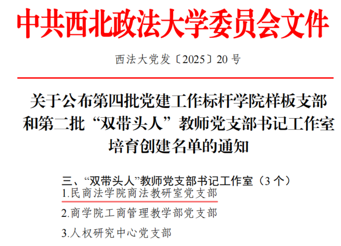 近日,学校公布了第四批党建工作标杆蓝鲸直播 样板支部和第二批“双带头人”教师党支部书记工作室培育创建名单。蓝鲸直播 商法教研室党支部获批西北政法大学第二批“双带头人”教师党支部书记工作室。