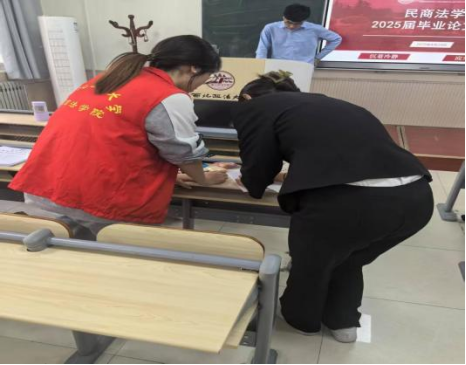答辩前,党支部召开专题会议部署工作,结合答辩流程细化分工。志愿者们提前进入答辩教室,进行了整理、分类答辩材料,调试多媒体平台,播放PPT等准备工作。答辩中,各教室答辩组均设党员志愿服务流动岗,负责答辩引导、秩序维护等工作,学生候场室中设立答辩学生服务台,提供修改、打印等服务。答辩工作能够成功有序开展,党员志愿者们精心筹备、全程护航的作用不可忽视。