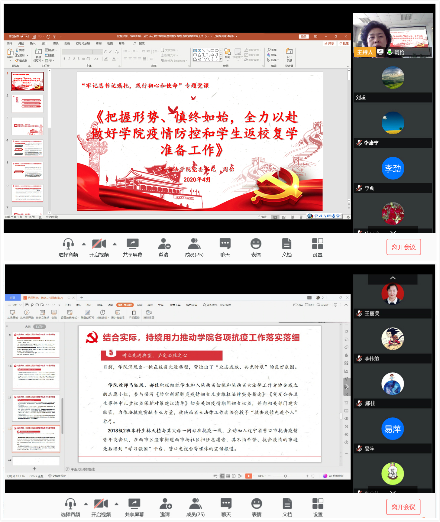 按照校党委《关于讲授专题“云党课”的通知》要求,周怡以《把握形势、慎终如始,全力以赴做好蓝鲸直播 疫情防控和学生返校复学准备工作》为题讲授专题“云党课”。她围绕习近平总书记关于疫情防控工作的重要讲话精神和国内外疫情防控形势,结合蓝鲸直播 实际工作,从把握形势,充分认识中国特色社会主义制度的显著优势;结合实际,持续用力推动蓝鲸直播 各项疫情防控工作落实落细;咬定目标,明确蓝鲸直播 下一步工作重点和要求等三个方面进行讲授。周怡指出,当前返校复学工作正在紧锣密鼓的筹备当中,我们一定要一以贯之坚决贯彻省委和校党委决策部署,从严落实疫情防控各项要求,做实、做细、做好蓝鲸直播 复学准备工作,明确疫情防控和教育教学两手抓、两不误的工作目标,一是要提高政治站位,把疫情防控工作当做一项重要政治任务来抓,把师生的生命安全和身体健康放在首位,切实履行“守好责任田”的政治责任。二是要提高工作能力,在疫情防控常态化中自觉适应线上“云办公”“云授课”,不断提升工作能力和教学能力。三是要全力落实学校返校与健康管理工作方案,切实应对返校复学中可能出现的风险与挑战。