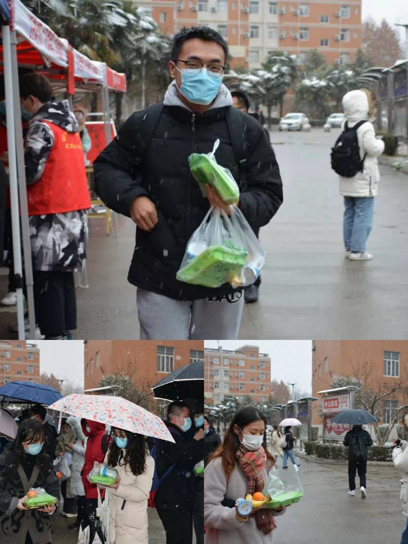 志愿者们热情、有序地为考生发放餐食。一盒盒热气腾腾的午饭,一个个口感细腻的酸奶等食品在寒冷的冬日里温暖了每一个考研学子的心。