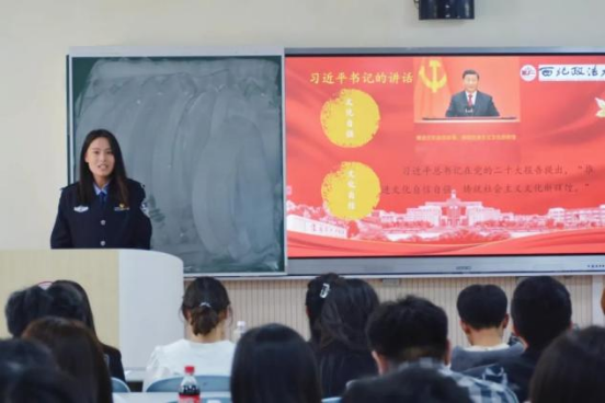 公安蓝鲸直播 宣讲人姚朵朵通过分享自己于西安、延安等地见闻中切身感受到的中华优秀传统文化和革命文化,引出了文化自信这一中心话题,经由民族自豪感的深切感召,呼吁青年学子坚定文化自信,自觉做中华优秀传统文化的传承者和弘扬者,赓续中华文脉,书写时代强音。