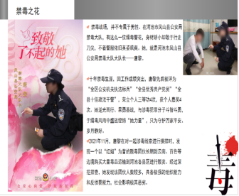 党心语同学首先介绍了国际禁毒日的由来和发展以及第36个国际禁毒日的主题——“防范新型毒品对青少年危害”。王燊同学分享了逆光而行、骁勇善战,与涉毒分子斗智斗勇,于缉毒战场铿锵盛放的“禁毒之花”,河池市凤山县公安局禁毒大队大队长唐黎的故事。