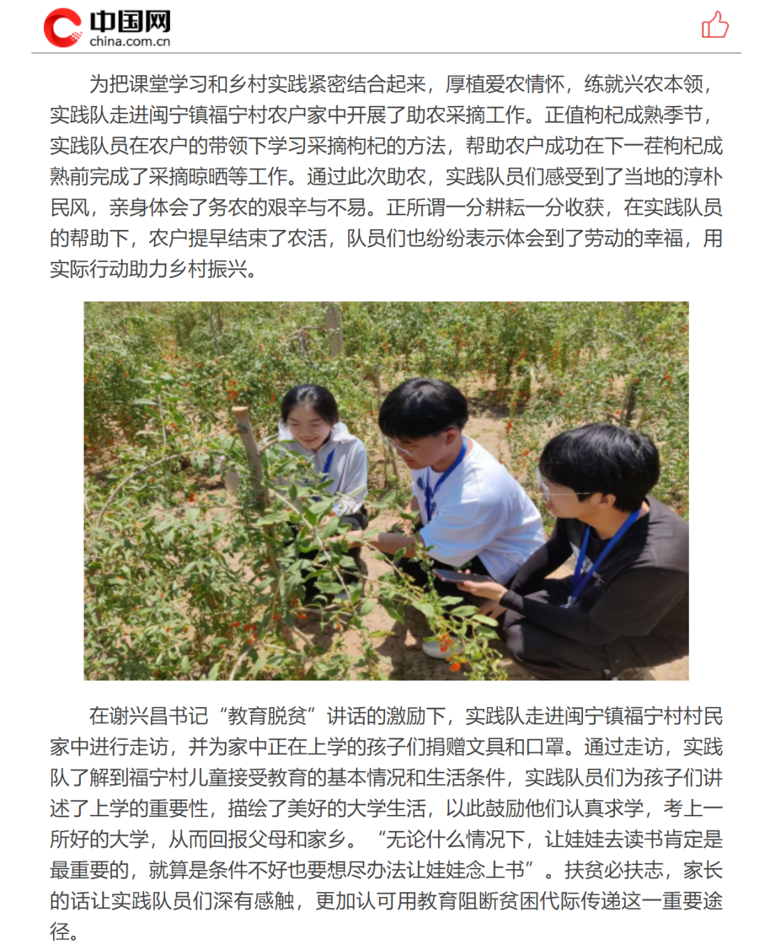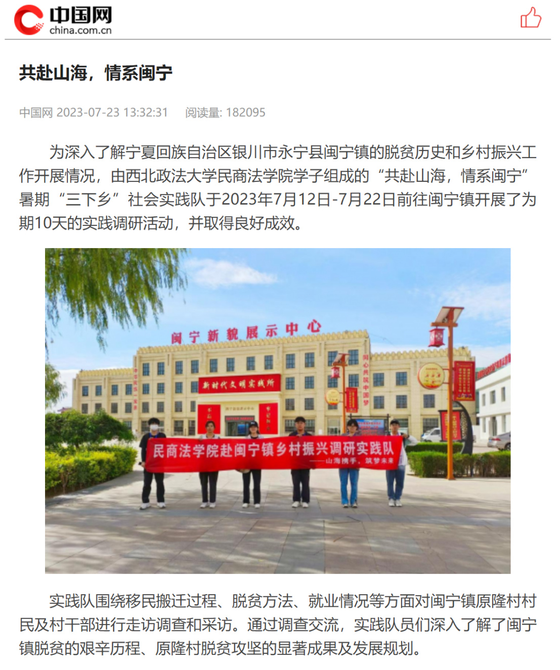 为引导学生把理论学习和乡村实践紧密结合起来,在社会大课堂中“受教育、长才干、做贡献”,2023年7月12日至7月22日,蓝鲸体育直播 “共赴山海,情系闽宁”实践队赴宁夏闽宁镇开展暑期“三下乡”社会实践活动,实践情况获中国网报道。