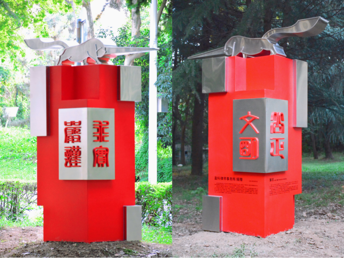 雕塑以抽象手法提取獬豸造型经典元素,尺寸以原件尺寸为基础放大一倍,造型雄健有力,威武勇猛,具有汉代艺术的豪放大气风格;独角夸张锐利,四足前后蹬直,尾部高举,浑身彰显着动感和力度。雕塑基座选取以印章形式展现学校校训:“严谨、求实、文明、公正”,红色象征生命、活力、健康、热情、朝气,四面环绕篆体校训,色彩色感温暖,刚烈而外向,与主题呼应,寓意西法大学子,谨记校训,勇毅前行!