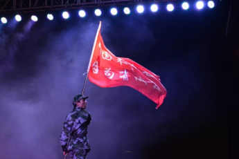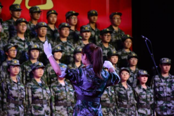 舞台前,红色横幅被摇动成波浪的形状,好似燎原的革命浪潮,淘旧换新,带来一番新气象。新时代的青年牢记使命,担当起民族复兴大任,就如同学们在校歌中所唱——“忠诚团结,紧张活泼……献身于新社会的建设,铸造成国家的栋梁。”豪迈雄浑的歌声响彻全场,唱出了军人之魂,唱出了青年热血,也唱出了对祖国的热爱,赢得了在场观众的阵阵掌声与喝彩,现场激情飞扬。