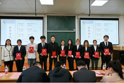 主持人介绍了新一届主席团成员,宣布新一届学生会各部门部长、副部长及优秀志愿者名单,刘超老师为新一届学生会主席团成员颁发聘书,丁艳艳老师为学生会各部门部长颁发聘书,张博玮老师和雷喆老师为学生会各部门副部长颁发聘书,刘洋老师和张智超老师为各部门优秀志愿者颁发荣誉证书,并合影留念。