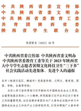 近日,中共陕西省委宣传部、中共陕西省委文明办、中共陕西省委教育工委、共青团陕西省委、陕西省学生联合会联合印发文件,通报了2023年陕西省大中专学生志愿者暑期文化科技卫生“三下乡”社会实践活动评选结果,蓝鲸体育直播 丁艳艳老师荣获“省级先进个人”称号。