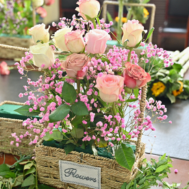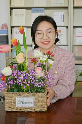妇女节当天,正是阳光明媚的时候,蓝鲸直播 资料室里充满了欢声笑语,老师们在进行趣味横生的插花活动。桌上已经摆好了丰富的花卉材料:相思果、康乃馨、向日葵、玫瑰和满天星……花朵娇嫩欲滴,竞相绽放。她们先是挑选自己心仪的花材,再对选好插好的花朵进行调整和裁剪。她们巧妙地将各种花材搭配在一起,创作出各有特色的花艺作品。