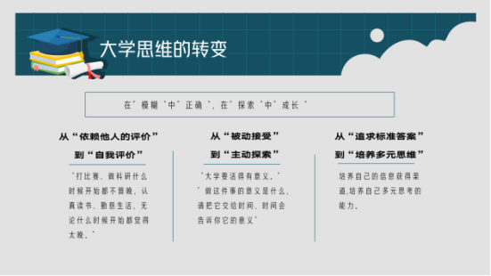 卢雅茹同学的分享则围绕大学生活的思维转变、心理调适和寻求帮助三个方面展开。她强调从依赖他人评价到自我评价的重要性,提倡从被动接受到主动探索的转变,并鼓励培养多元思维。在心理调适方面,她讨论了如何走出舒适区、应对比较压力、从失败中学习和积极面对压力。最后,她提供了在需要时寻求心理咨询的建议和途径,旨在帮助学生积极适应大学生活,实现个人成长。