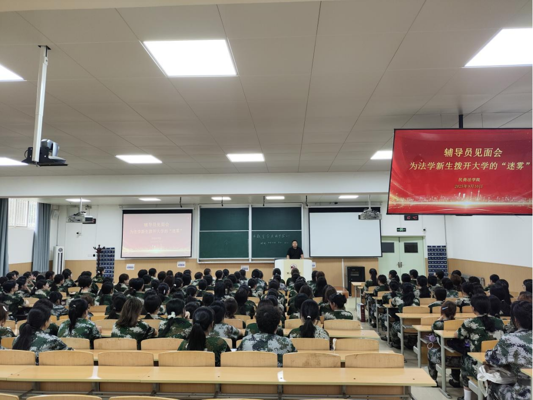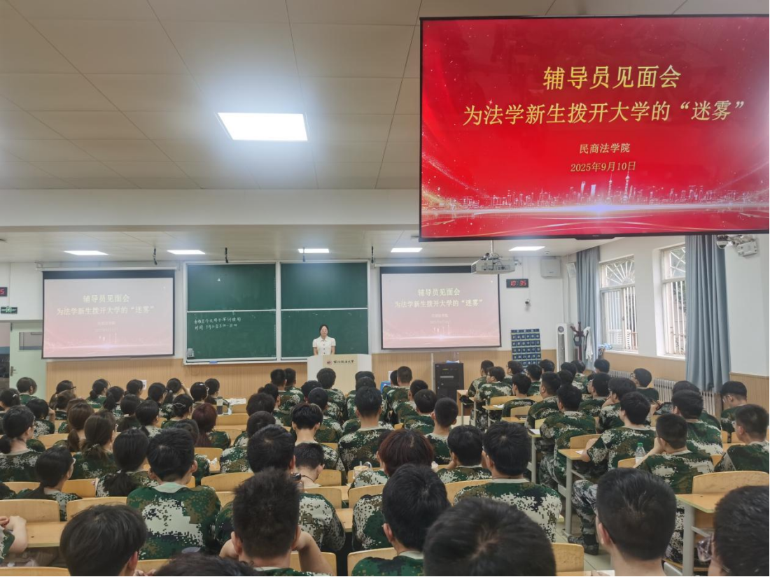 9月10日,蓝鲸体育直播 在天平楼BJ13召开“为法学新生拨开大学的迷雾”辅导员见面会,2025级辅导员丁艳艳、张智超及全体新生参会。