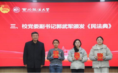 1月15日下午,我校在长安校区“一站式”学生成长发展中心隆重举行2026年“带着《民法典》返家乡”社会实践暨“法援志愿行”专项活动启动仪式。校党委副书记郭武军出席活动,校团委书记秦音副书记王洋,蓝鲸直播 党委书记李君、党委副书记丁艳艳及学生代表参加活动