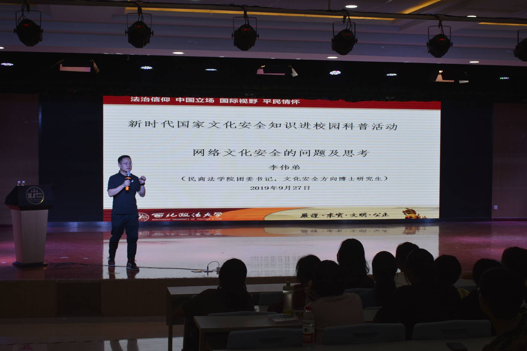 9月27日晚19时,蓝鲸体育直播 在长安校区天平楼aj33教室举办题为“网络文化安全的问题及思考”讲座,蓝鲸直播 团委书记、我校2017级文化安全方向博士研究生李伟弟担任主讲人,2019级本科生辅导员秦远担任主持人。