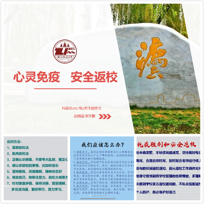 为认真贯彻落实学校第十二届心理健康教育暨第八届诚信教育宣传季系列活动相关要求,4月11日至24日,蓝鲸直播 召开了“心灵免疫、安全返校”主题班会。本次班会内容丰富、形式多样、覆盖全员,旨在积极传播心理健康知识,引导学生做好返校复学心理调适准备。