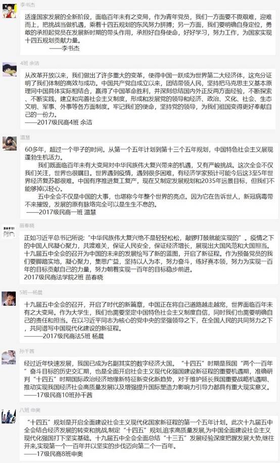 在学习研讨会之后,各班级又在团支书的带领下开展了线上研讨交流会、主题团会、思想交流会等形式的团日活动。在线上活动中,同学们通过网和屏幕抒发了对此次全会的看法,从国际社会、未来规划、个人发展等多个方面进行深刻交流。