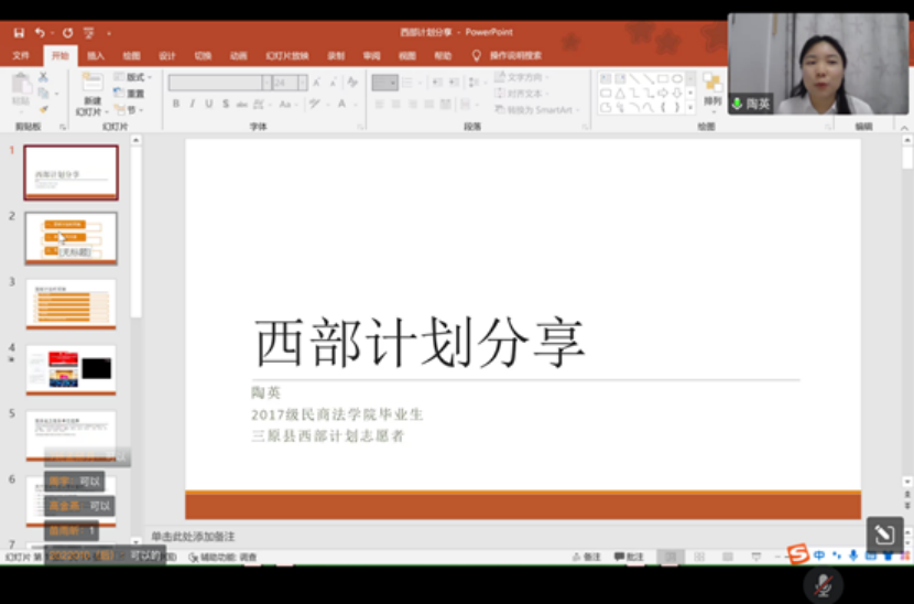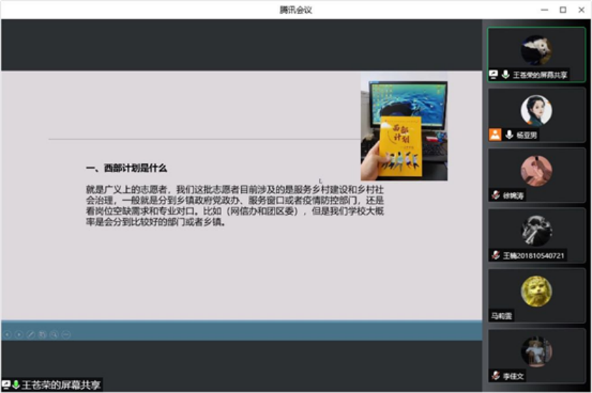 为了进一步推动西部计划宣传工作,提升蓝鲸体育直播 毕业生对西部计划的认知程度,引导和鼓励优秀大学生参与到服务基层,报效祖国的行列中来,4月22日,蓝鲸直播 召开了西部计划志愿者经验交流分享会。本次会议邀请了往届毕业生中优秀的西部计划志愿者王苍荣、陶英同学以及2022届已就业毕业生千韵司、习耀蕾、任昕航同学与大家做交流分享。2022届毕业生代表参会,2018级辅导员杨亚男主持会议。