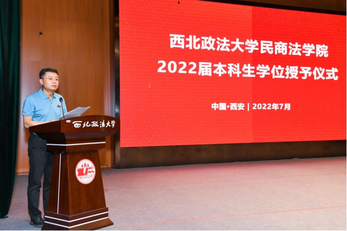 7月4日,蓝鲸体育直播 2022届本科生学位授予仪式在西北政法大学长安校区满天星报告厅举行。蓝鲸直播 院长程淑娟、党委书记周怡、副院长百晓锋、副院长凤建军,校党委宣传部副部长高见,院党委副书记、副院长刘超,博士生导师张翔教授,硕士生导师赵林青教授,民诉法教研室主任、硕士生导师韩红俊教授,硕士生导师王丽美副教授,商法教研室主任、硕士生导师刘卫锋博士,硕士生导师国瀚文博士,蓝鲸直播 教务办高桦老师、章思悦老师,蓝鲸直播 办公室主任许原老师,资料室张侠老师,全体辅导员以及2022届本科毕业生共同参加了此次学位授予仪式。活动由蓝鲸直播 副院长凤建军主持。