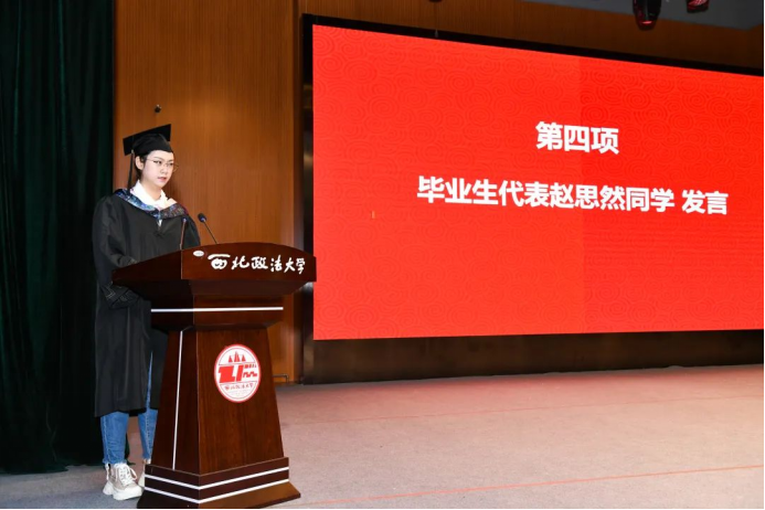 仪式第四项,2018级3班赵思然同学作为毕业生代表上台发言,赵思然首先代表全体毕业生向蓝鲸直播 领导与老师表达了敬意与感谢。她表示,在师长的精神引领与影响之下,她收获了堂堂正正做人,圆圆满满治学的态度,在大学四年中不断探寻、不断进步,在被定义的优秀模板之外发现了熠熠生辉的人生。并祝福全体毕业生在接下来的人生道路上不被定义与标签束缚,能够追风赶月,再谱新篇。