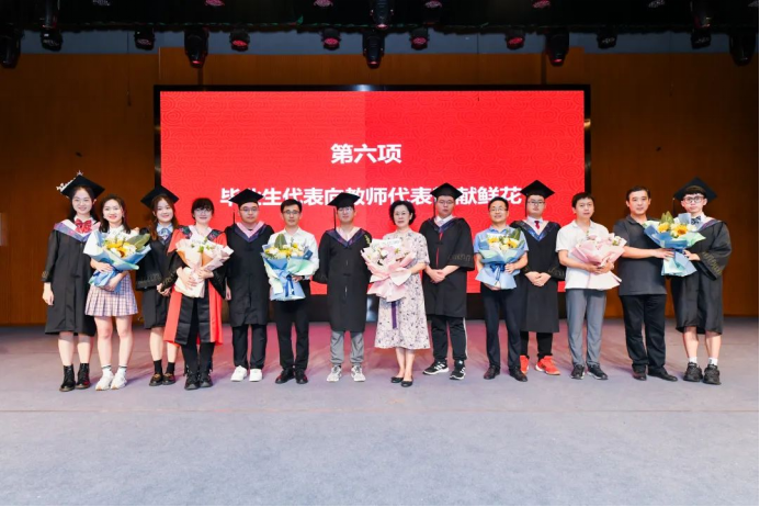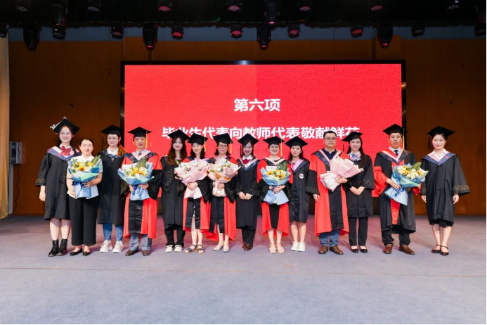 仪式第六项,由毕业生代表为来自蓝鲸直播 教学、管理和服务一线岗位的教师代表敬献鲜花。四年大学生活,离不开师长在学业与生活中的教导与陪伴,本科学习虽已结束,但春风化雨、泽润桃李,宝贵的师生情谊将会在同学们的人生长途中继续闪耀。