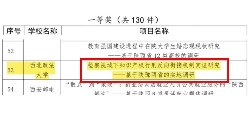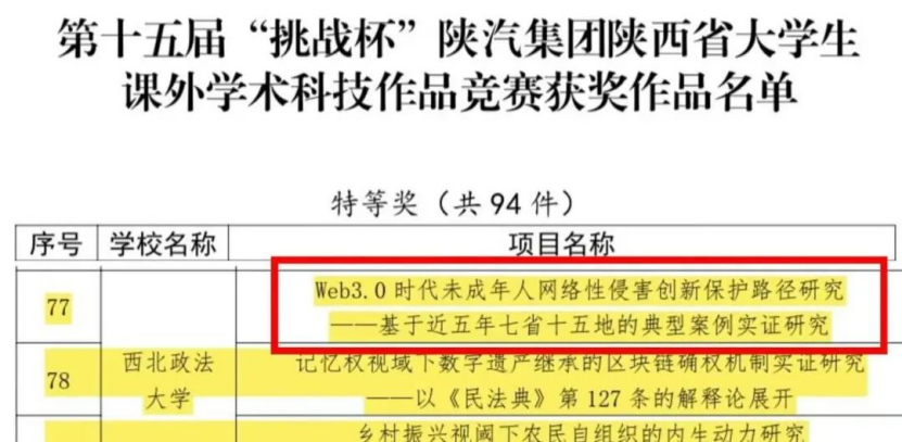 经过省级评审与现场答辩,郑行红团队《Web3.0时代未成年人网络性侵害创新保护路径研究——基于近五年七省十五地的典型案例实证研究》获得省级特等奖,刘博洋团队《检察视域下知识产权行刑反向衔接机制实证研究——基于陕豫两省的实地调研》获得省级一等奖。