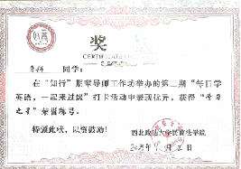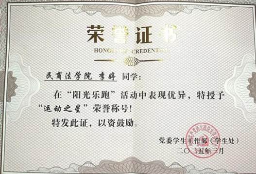 尘雾之微,补益山海;荧烛末光,增辉日月。我担任班级班干部、院学生会宣传部志愿者;班级综测排名第2名,年级综测排名第7名;注册有个人的公众号账号“生与斯长于斯”,发表个人的读书感悟与实践思考,以及对社会热点的看法与认识。并获得西北政法大学第十三届大学生读书打卡优秀证书。同时,我积极参与校园文化建设,获得校园马拉松第 11 名的名次、高校跑团联盟比赛团体第4名的好成绩、获得校园“阳光乐跑”运动之星荣誉称号、心理季主题活动获得二等奖等,努力为校园文化建设贡献个人力量。