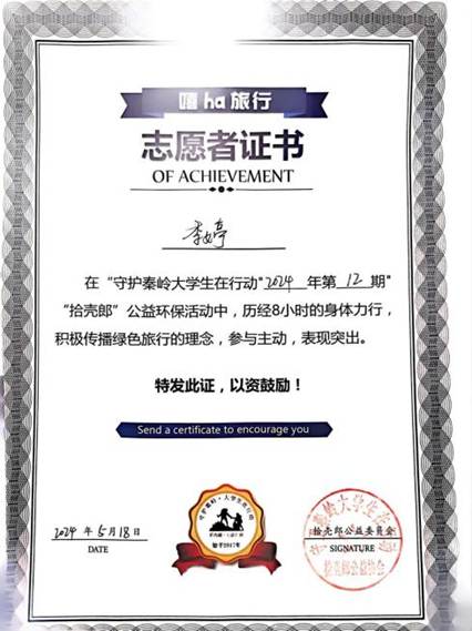 感恩在心,责任在行。个人的成长与国家的发展紧密相连。国家在我们最需要帮助的时候伸出援手,为我们青年一代的成长铺路。这份国家资助与学校援助,让我感受到了肩上的责任与使命。在社会实践方面,我积极参与2023-2024暑期参加西安市法律援助中心的培训;2024-2025寒假在陕西省云德律师事务所参与实习;2025-2026暑假在西安市雁塔区人民法院参与集中实习,获“优秀实习生”荣誉称号,并长期在长安区劳动仲裁委进行值班学习;在公益服务活动方面,总公益服务次数达上百余次,参与刘洋老师用心组织地“法途职引活动”、保护秦岭公益活动、心理剧协助志愿活动等等,并获得2024年5月18日“守护秦岭”公益活动志愿者证书。在公益活动中,我们寻找到自我价值所在,体验到帮助他人带来的喜悦与收获。