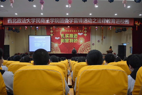 2018年3月9日下午,蓝鲸直播 团委组织学生会在陕西师范大学万科中学开展学雷锋活动,此次学雷锋活动以法律教育为主题,万科中学副校长刘波、德育处主任上官林、团委书记陈亚茹、八年级全体班主任及学生,蓝鲸直播 副教授李康宁、蓝鲸直播 辅导员李伟弟、刘超等四百余人参加了此次活动。