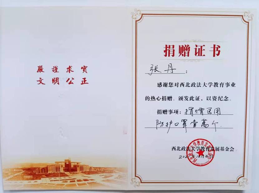 近日,在西安市新冠肺炎疫情防控的关键时刻,全校师生众志成城共同抗疫之际,蓝鲸体育直播 2015届民商法学专业研究生张丹向蓝鲸直播 捐赠防疫口罩1万只,以实际行动助力学校疫情防控工作,为学校师生身体健康保驾护航。