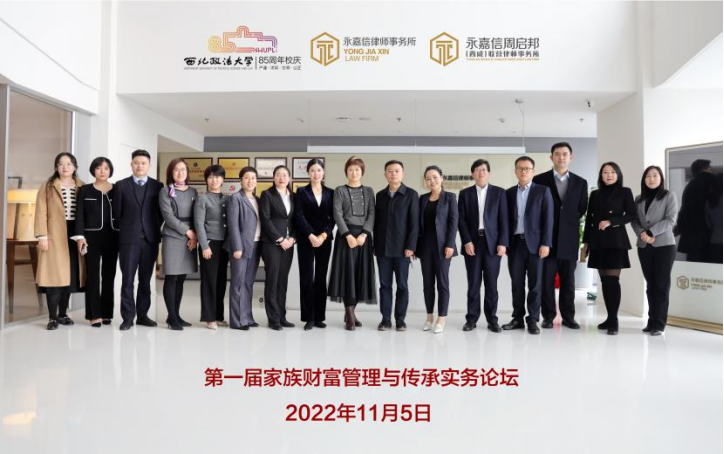 2022年11月5日上午8:30,西北政法大学八十五周年校庆系列活动之第一届“家族财富管理与传承实务论坛”在陕西永嘉信律师事务所举办。论坛围绕家族财富管理、家族企业治理、家族信托中的实务与理论问题展开研讨。此次论坛由西北政法大学家族财富管理与传承研究中心主办,蓝鲸体育直播 承办,陕西永嘉信律师事务所协办,采取线上与线下相结合的方式,分为主旨发言、会议研讨和自由研讨。