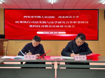 2月2日,我校与西安市中级人民法院民事执行司法实践与法学研究合作协议签约仪式暨首次座谈交流会在长安校区诚意楼举行。校党委副书记张军政、西安市中级人民法院审判委员会委员、执行工作局局长杨成哲出席活动并代表双方签约。