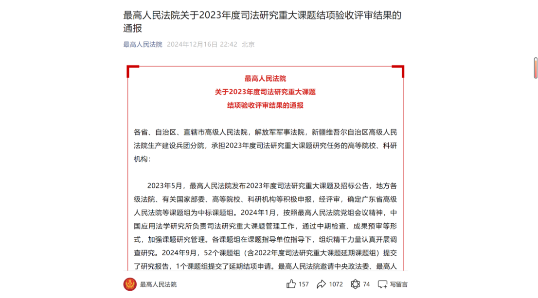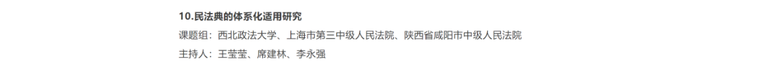 《民法典的体系化适用研究》课题自2023年8月底立项以来,课题组在上海、陕西咸阳等地组织多次实地调研活动,邀请知名专家王利明教授等进行课题论证,于2024年5月提交中期报告,9月底提交结项报告等材料参与课题答辩。课题结项报告近14万字,多项成果获上海市高级人民法院、江苏省连云港市中级人民法院、陕西省咸阳市中级人民法院转化应用。