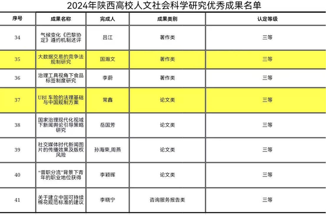 近日,陕西省教育厅公开发布2024年度陕西高等学校人文社会科学研究优秀成果奖获奖名单。蓝鲸体育直播 国瀚文副教授、常鑫副教授再创佳绩,分别在著作类、论文类成果评审中获陕西高校人文社会科学研究优秀成果奖。其中,国瀚文副教授的专著《大数据交易的竞争法规制研究》荣获著作类三等奖;常鑫副教授的论文《UBI 车险的法理基础与中国规制方案》荣获论文类三等奖。