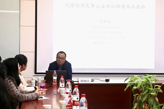 随后,刘加良作题为“刑事附带民事公益诉讼的困局与出路”的报告。他以刑事附带民事公益诉讼案件后来居上的原因、基本法律规范依据、主体困境与破解三个层面与与会人员分享了自己的理解与观点。