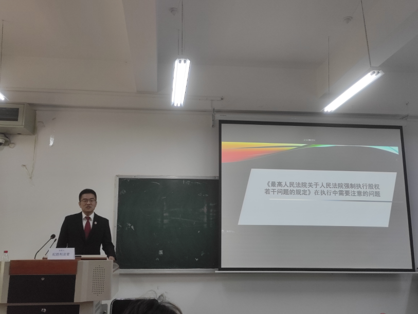 纪胜利法官以《最高人民法院关于人民法院强制执行股权若干问题的规定》为切入点,结合实务案例,与同学们进行就强制执行中的疑难问题进行了剖析。同时,他结合自身经历,鼓励大家在实习过程中要积极地去基层法院学习,用身、心、灵去感触司法,理解真实的法律。最后,他针对大家提出的执结率、执行异议之诉等问题一一作出回答。