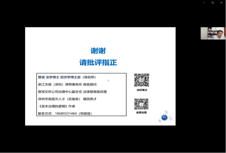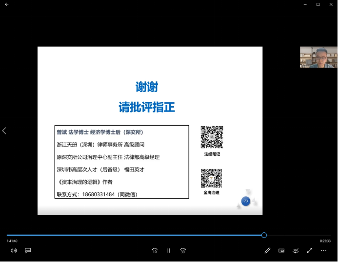 首先,主持人程淑娟院长为大家介绍了主讲人曾斌,曾博士现为浙江天册(深圳)律师事务所高级顾问。兼任深圳国际仲裁院仲裁员,南开大学中国公司治理研究院研究员、深圳市公司治理研究会顾问。曾参与《证券法》《上市公司治理准则》修订工作,在国内外核心期刊发表论文四十余篇,著有《资本治理的逻辑》。