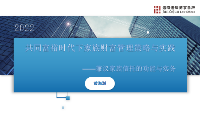 讲座开始,黄海洲律师从新时代的共同富裕理念、家族信托的定义与功能、家族信托的案例分享、保险金信托等四个部分对家族财富管理策略与实践进行介绍,对家族信托的内涵、功能及实务进行了阐述。