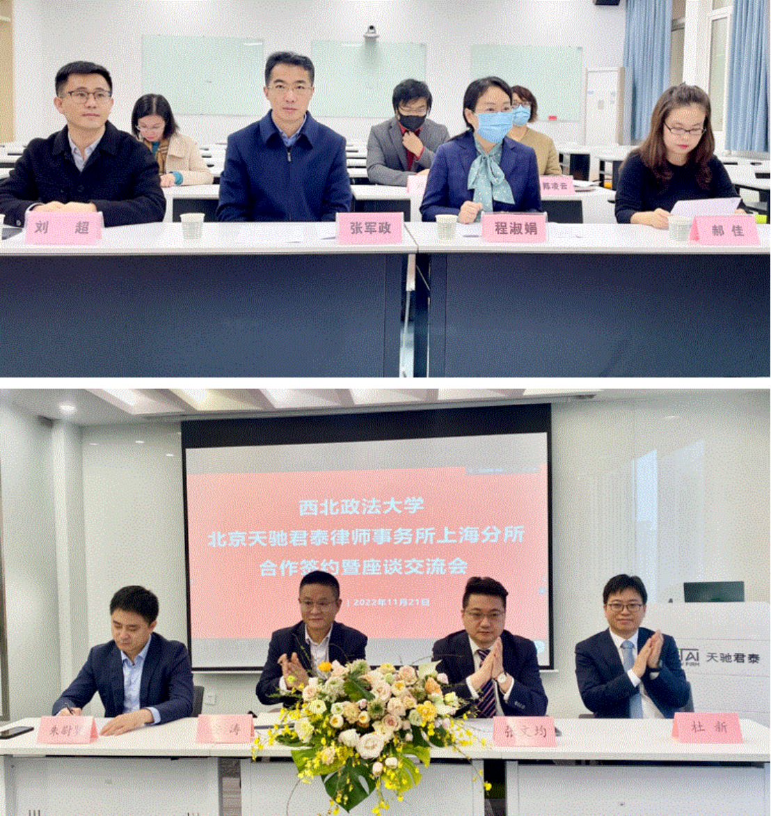 2022年11月21日上午,西北政法大学与北京天驰君泰律师事务所上海分所举行合作签约暨特聘教授、硕士生导师聘任仪式。本次仪式上,北京天驰君泰律师事务所上海分所高级合伙人杜新律师被聘任为特聘教授兼硕士生导师,合伙人朱尉贤律师被聘任为硕士生导师。