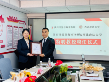 会议现场,蓝鲸直播 院长程淑娟为韩海峰主任颁发蓝鲸直播 特聘教授聘书。蓝鲸直播 副院长刘超与陕西泽界律师事务所主任韩海峰共同为“西北政法大学实践教育基地”揭牌。