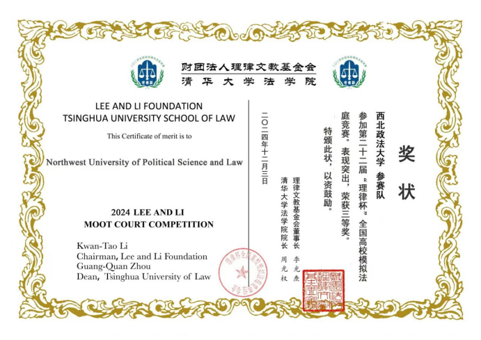2024年11月29日至12月3日,第二十二届“理律杯”全国高校模拟法庭竞赛在清华大学顺利举行。我校代表队准备充分,凭借扎实的法学理论功底和沉着冷静的临场应变能力,以小组第一的成绩从四十支队伍中脱颖而出,进入本次赛事八强之列,最终获得本次比赛全国三等奖、最佳书状奖。