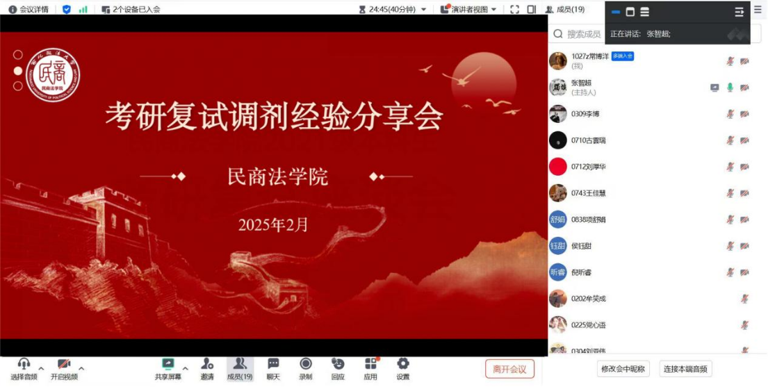 会后,张智超提醒同学们在复试时要保持自信,注重与考官的互动,展现出自身的学术潜力,并鼓励同学们在调剂过程中要保持积极心态,合理选择目标院校和专业。