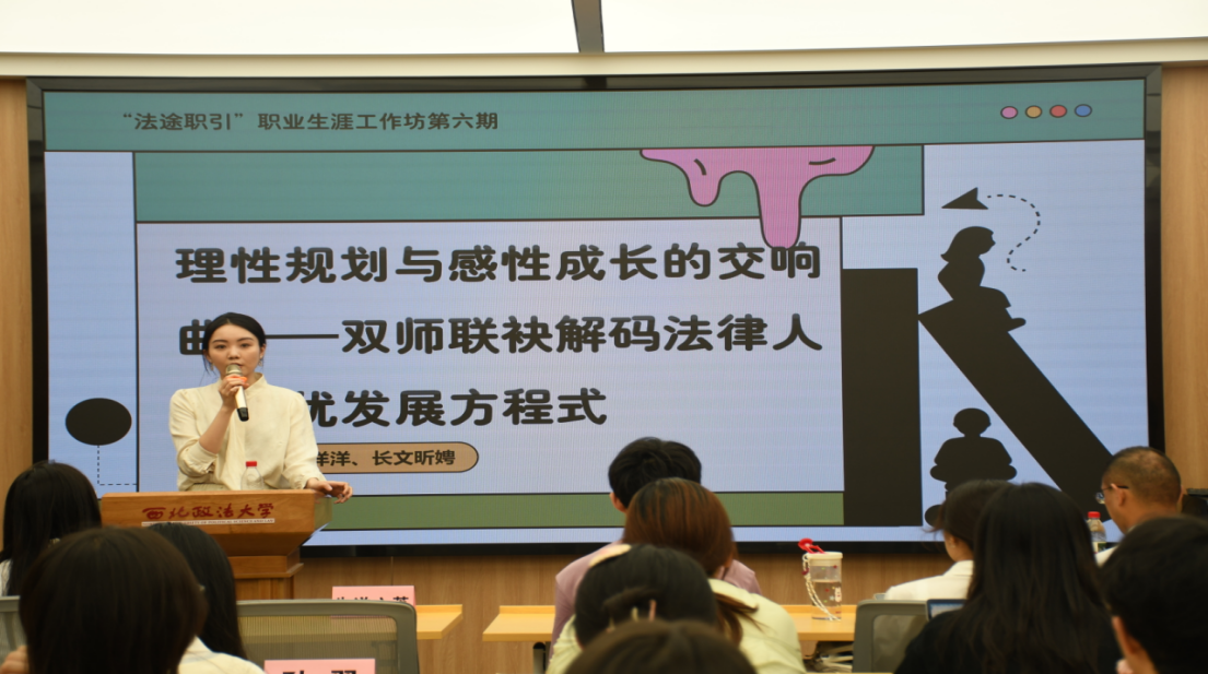 长文昕娉老师则聚焦“法学生内在力量的觉醒与续航,深度剖析法律人成长过程中的心理建设与自我驱动。她对在座同学提出三点建议:一是要合理选择,在充分了解自己的性格的前提下,选择适合自己的道路与职业;二是要坚定自己的道路,充分相信自己的决定,不被外界的声音所干扰三是要努力学习在学习的过程中不断充实自己,提升各方面能力,最终实现个人的成功
