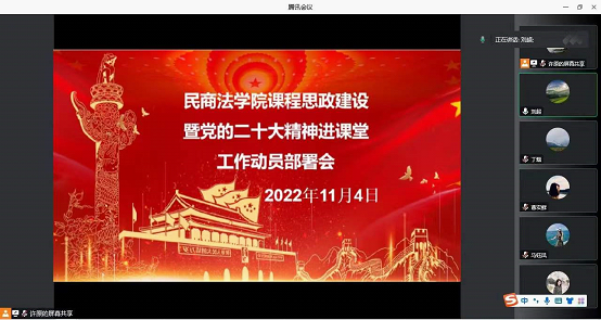 为深入学习宣传贯彻党的二十大精神,根据中央教育工作领导小组秘书组、教育部党组根印发《关于教育系统深入学习宣传贯彻党的二十大精神的通知》精神、《西北政法大学关于加快建设高水平本科教育,全面提高人才培养能力的意见的通知》要求,2022年11月4日,蓝鲸直播 召开了“课程思政建设暨党的二十大精神进课堂”工作动员部署会。