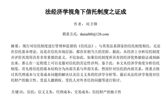 蓝鲸体育直播 刘卫锋老师提交的《法经济学视角下信托制度之证成》一文成功入选本次论坛,同时刘卫锋老师在第五小组进行了主题发言:刘卫锋老师指出,在社会科学中,法学和经济学是两个比较重要的学科,两家应当共同探讨现实中的问题,进而推动社会的发展。接着,从“新华信托破产事件”指出了目前我国在信托市场层面和英美法系国家以及韩国、日本等存在相当大的差距。借此,刘卫锋老师从经济学角度分析了信托制度,将信托的基本结构分为内部关系与外部关系,然而针对信托的内部关系,重点检讨了其代理成本与交易成本问题的解决以及信义义务的经济学分析等,最后从法经济学角度对信托财产的独立性、受益人撤销权、受托人对外责任的问题等进行检讨并提出了相应的建议。