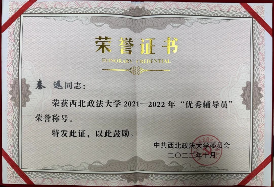 分别荣获西北政法大学第五届辅导员素质能力大赛二等奖、西北政法大学第六届辅导员素质能力大赛二等奖、学习贯彻落实《思政课是落实立德树人根本任务的关键课程》重要文章精神征文比赛三等奖;西北政法大学第三届形势与政策课件比赛二等奖、西北政法大学第三届形势与政策讲课比赛三等奖;西北政法大学暑期三下乡社会实践优秀指导教师;西北政法大学优秀党史宣讲人等荣誉。
