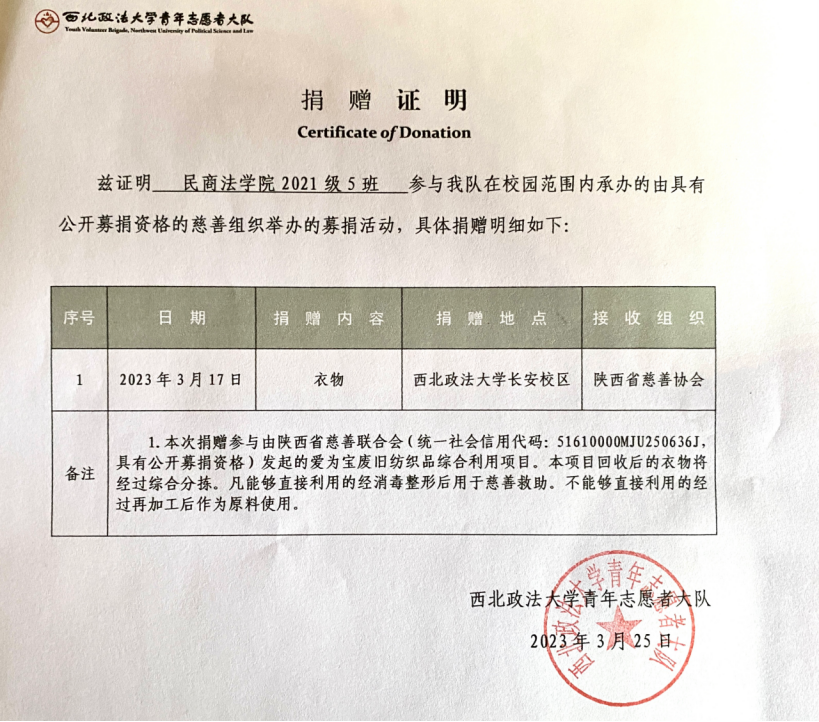 西北政法大学青年志愿者大队将联系捐赠组织将这份“爱心”送至困难群众手中。当旧衣物和旧书籍被传递出去时,它们便被赋予了全新的意义,它们便成为了传递温暖与爱心的桥梁与纽带,成为了新时代雷锋精神的写照。