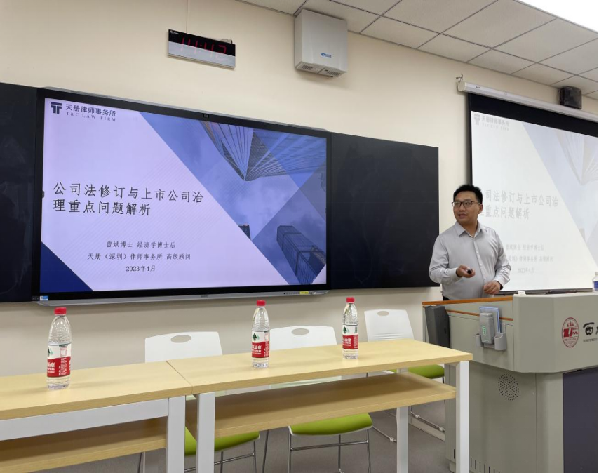 曾博士首先对上市公司治理结构概览进行了介绍。接着,从公司尤其是上市公司,应当由谁治理,现实中实际由谁治理的问题引导与会师生思考,列举大量一手数据说明现行公司法所构建的公司治理结构与现实并不匹配。最后,曾博士回到讲堂的主题,在解读公司法修订草案中董事会职权调整、法定代表人候选范围、董事责任的限制与免除、董事会下审计委员会取代监事会的新方案等关于公司治理核心问题的基础上,通过控股股东和实际控制人在上市公司中的核心现实地位,所引发的上市公司收购与反收购事件中发生一系列诸如“双头董事会”等问题,阐释其背后的原因和机理,最终揭示公司法在公司治理结构方面的应然规范内容。