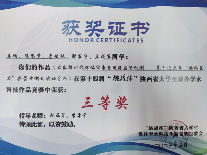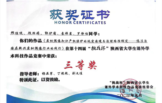 经过省级评审与现场答辩,姜硕团队《大数据时代媒体审查与网络监管机制--基于近五年“网络暴力”典型案例的实证分析》,邢恬悦团队《虚拟偶像知识产权保护的现实困境与治理路径探究——依法治国在新兴虚拟偶像行业的践行》等2件作品均获省赛三等奖。