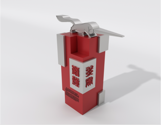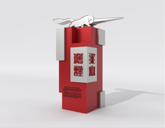 雕塑以抽象手法提取獬豸造型经典元素,尺寸以原件尺寸为基础放大一倍,造型雄健有力,威武勇猛,具有汉代艺术的豪放大气风格;独角夸张锐利,四足前后蹬直,尾部高举,浑身彰显着动感和力度。雕塑基座选取以印章形式展现学校校训:“严谨、求实、文明、公正”,红色象征生命、活力、健康、热情、朝气,四面环绕篆体校训,色彩色感温暖,刚烈而外向,与主题呼应,寓意西法大学子,谨记校训,勇毅前行!