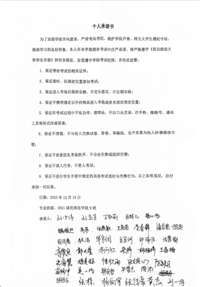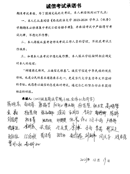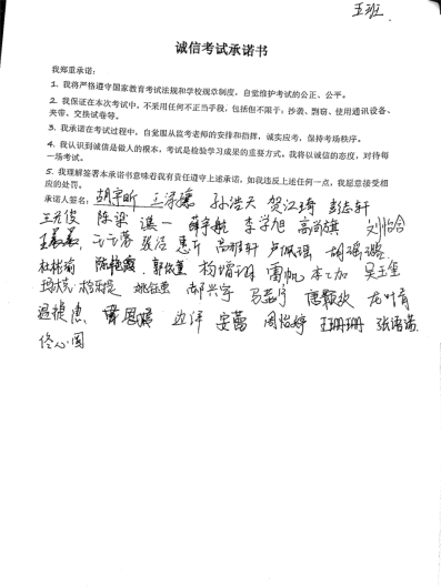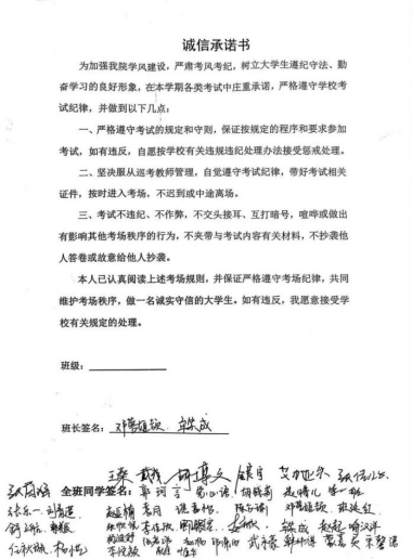 此外,各班还组织集中签订了“考试诚信承诺书”。同学们纷纷在“考试诚信承诺书”上签下自己的名字,表达了自己将严格遵守考试纪律,坚决抵制任何形式的作弊行为的决心。